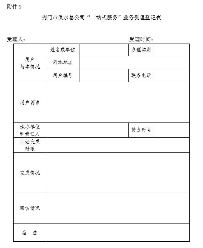 9.《荊門市供水總公司“一站式服務(wù)”業(yè)務(wù)受理登記表》