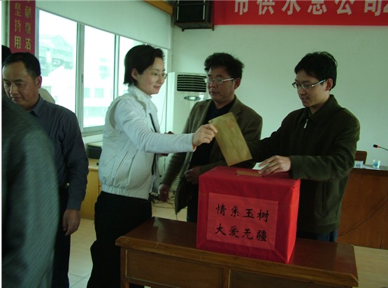 4月26日,荊門(mén)市供水總公司舉行“情系玉樹(shù) 大愛(ài)無(wú)疆“捐款活動(dòng),供水職工慷慨解囊、捐款踴躍,短短的時(shí)間,共募得善款18170元,圖為捐款現(xiàn)場(chǎng)場(chǎng)景。