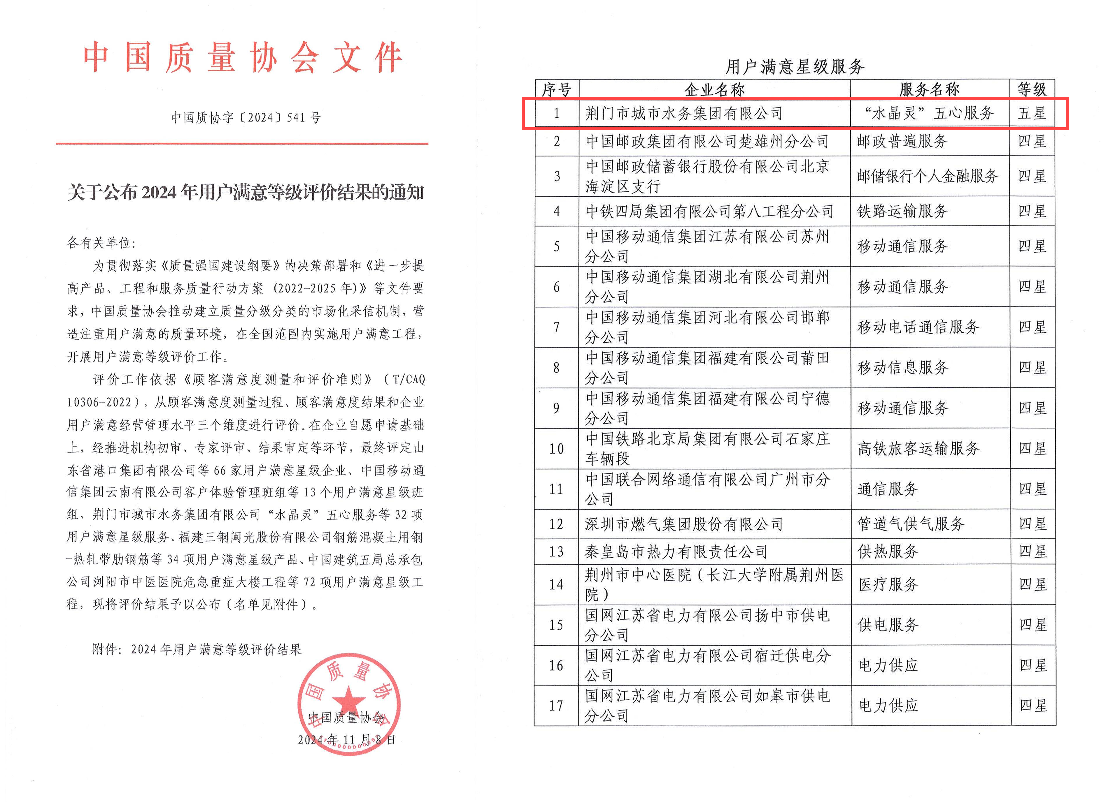 11月8日,中國質(zhì)量協(xié)會公布2024年用戶滿意等級評價結(jié)果,荊門市城市水務集團有限公司(以下簡稱“集團”)以“水晶靈”五心服務模式為特色,成為全國唯一一家獲評服務類五星的企業(yè),標志著在供水服務領域已經(jīng)成為全國標桿。