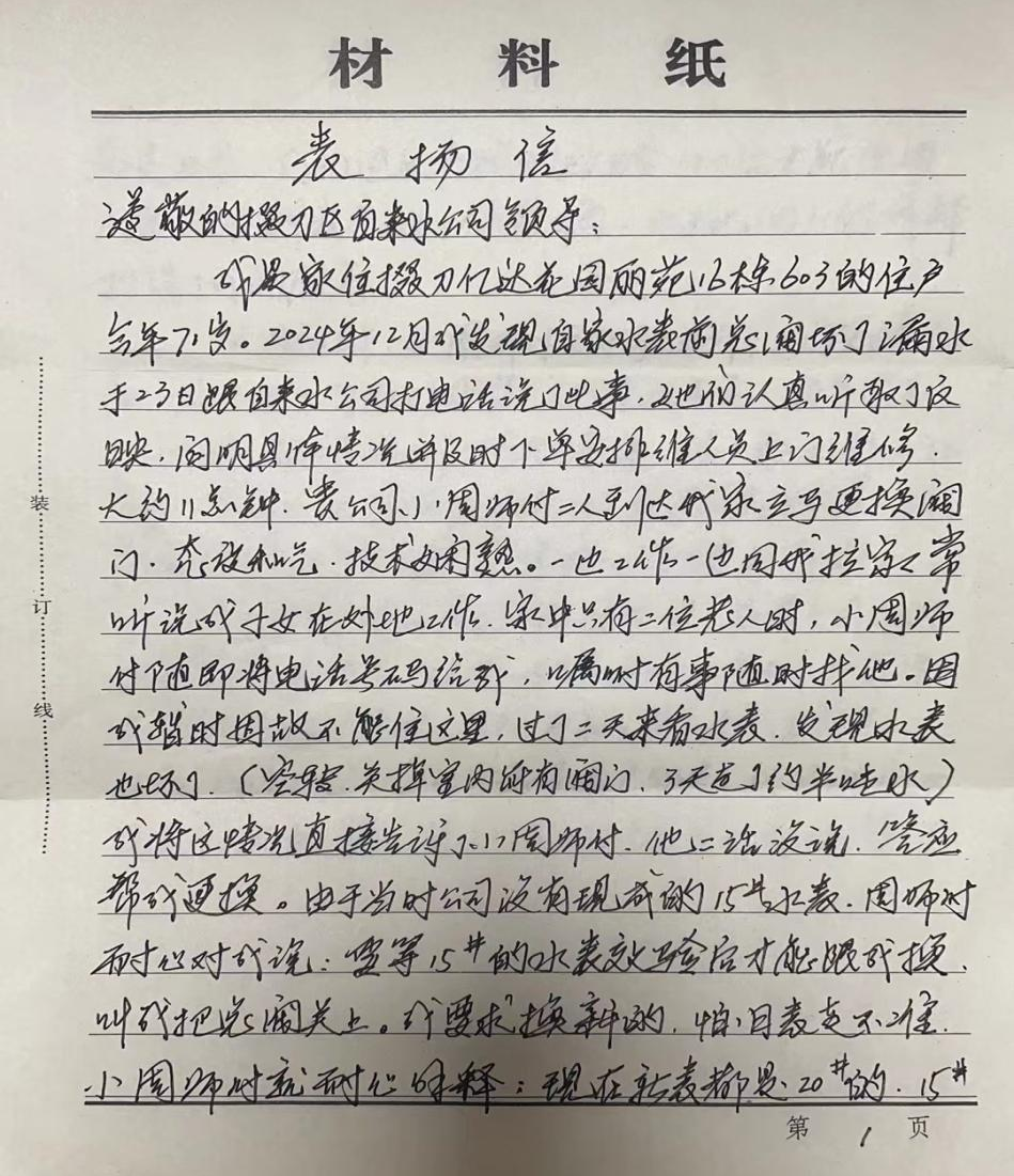 在表揚(yáng)信中,老人深情表達(dá):“家中只有我們兩位老人,水務(wù)集團(tuán)的維修人員就像我們的兒子一樣,他說話和氣,服務(wù)周到,技術(shù)過硬,動作麻利,作風(fēng)清廉,讓我們感到無比溫暖。”