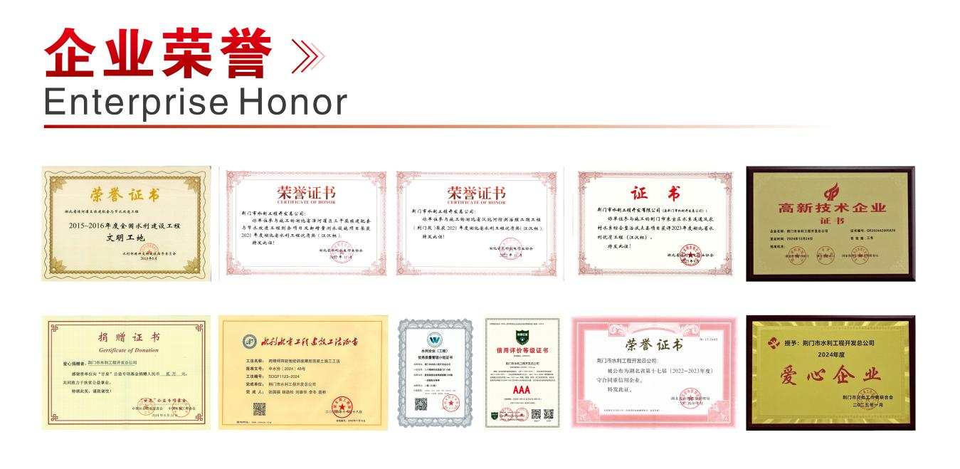 承建的湖北省漳河灌區(qū)續(xù)建配套與節(jié)水改造工程被國家水利部、省水利廳授予“文明工地”稱號;承建的湖北省漳河灌區(qū)三干渠續(xù)建配套與節(jié)水改造工程、漢北河防洪治理工程、漢西水系連通工程、東寶區(qū)水系連通工程等項(xiàng)目獲得“湖北省水利工程優(yōu)質(zhì)獎(江漢杯)”榮譽(yù)稱號。