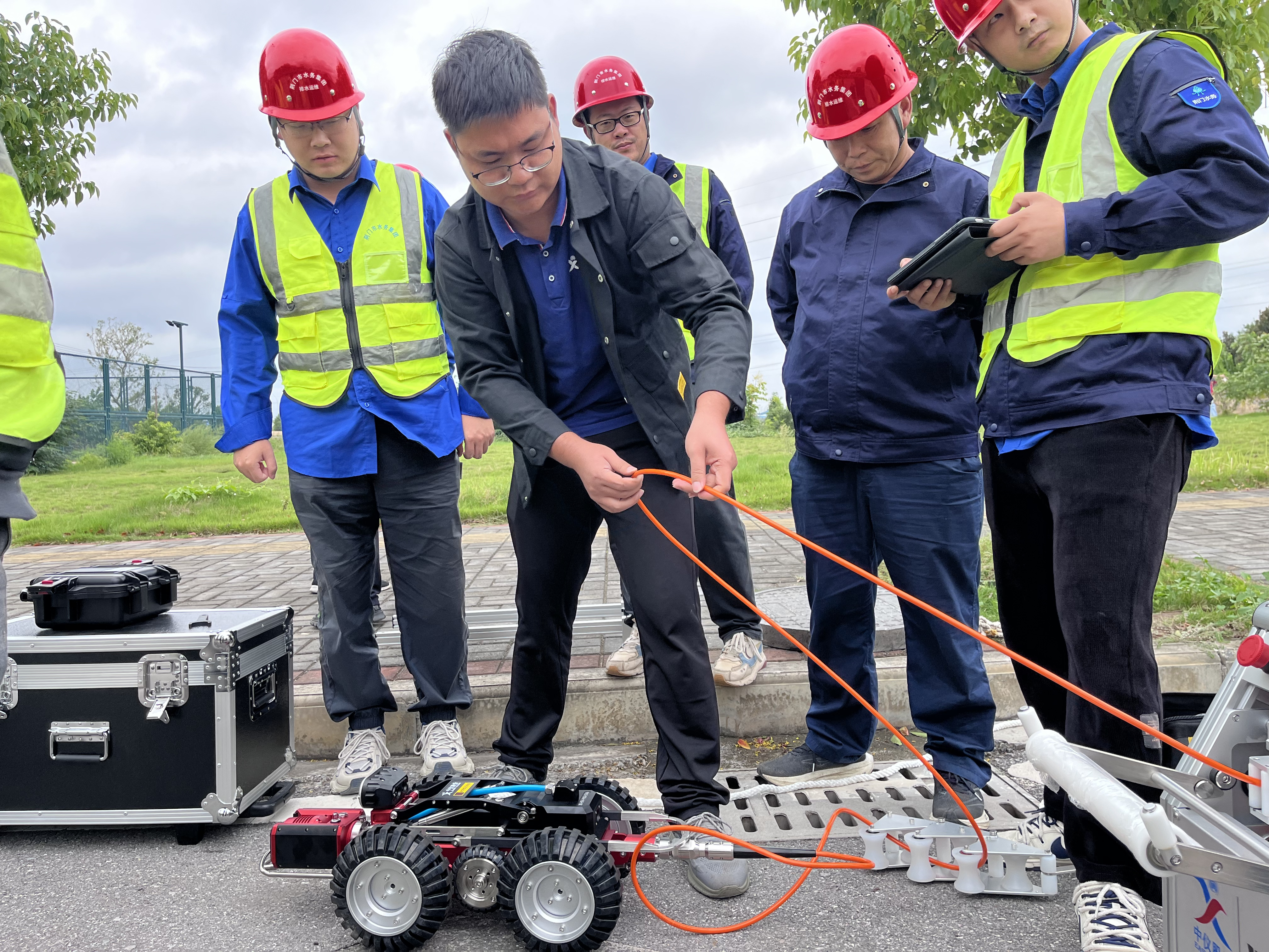 隨后,實戰(zhàn)演練正式拉開帷幕。在管道排查現(xiàn)場,參訓(xùn)學(xué)員分組實操,授課老師全程跟蹤指導(dǎo),及時糾錯,確保每位員工都能熟練掌握機(jī)器人的使用技巧。隨著機(jī)器人在管道內(nèi)靈活穿梭,高清畫面實時傳輸至控制終端,管道內(nèi)部的每一處細(xì)節(jié)都清晰可見。大家一邊操作,一邊根據(jù)畫面反饋調(diào)整機(jī)器人姿態(tài),精準(zhǔn)捕捉管道裂口、錯口、沉降等故障點。