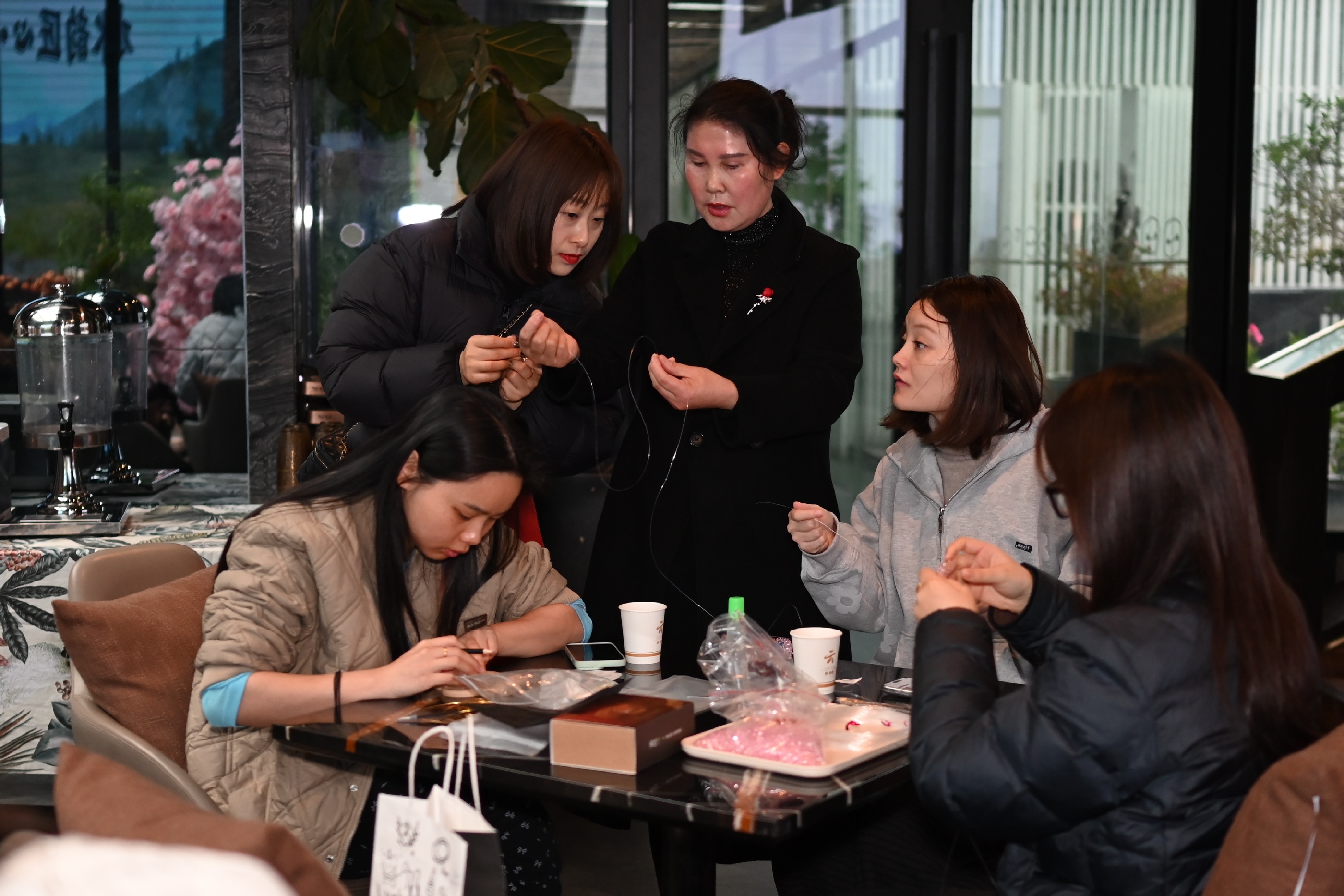 活動伊始,兩位指導老師分別講解掐絲琺瑯的技法和串珠包的編織技巧。隨后,女員工們們迅速投入創(chuàng)作——掐絲琺瑯工藝區(qū),大家用鑷子將金絲彎折成型,在盤底勾勒出蓮花、游魚或水波紋,再用鏟刀將彩砂層層點染,金絲與釉料交相輝映,一幅幅作品逐漸呈現(xiàn)。一旁的串珠包制作區(qū)同樣熱鬧非凡,晶瑩珠串在指尖流轉(zhuǎn)穿梭,穿針引線、配色綰結,巧思于方寸間緩緩鋪展,一只只精巧別致的串珠包悄然成型。