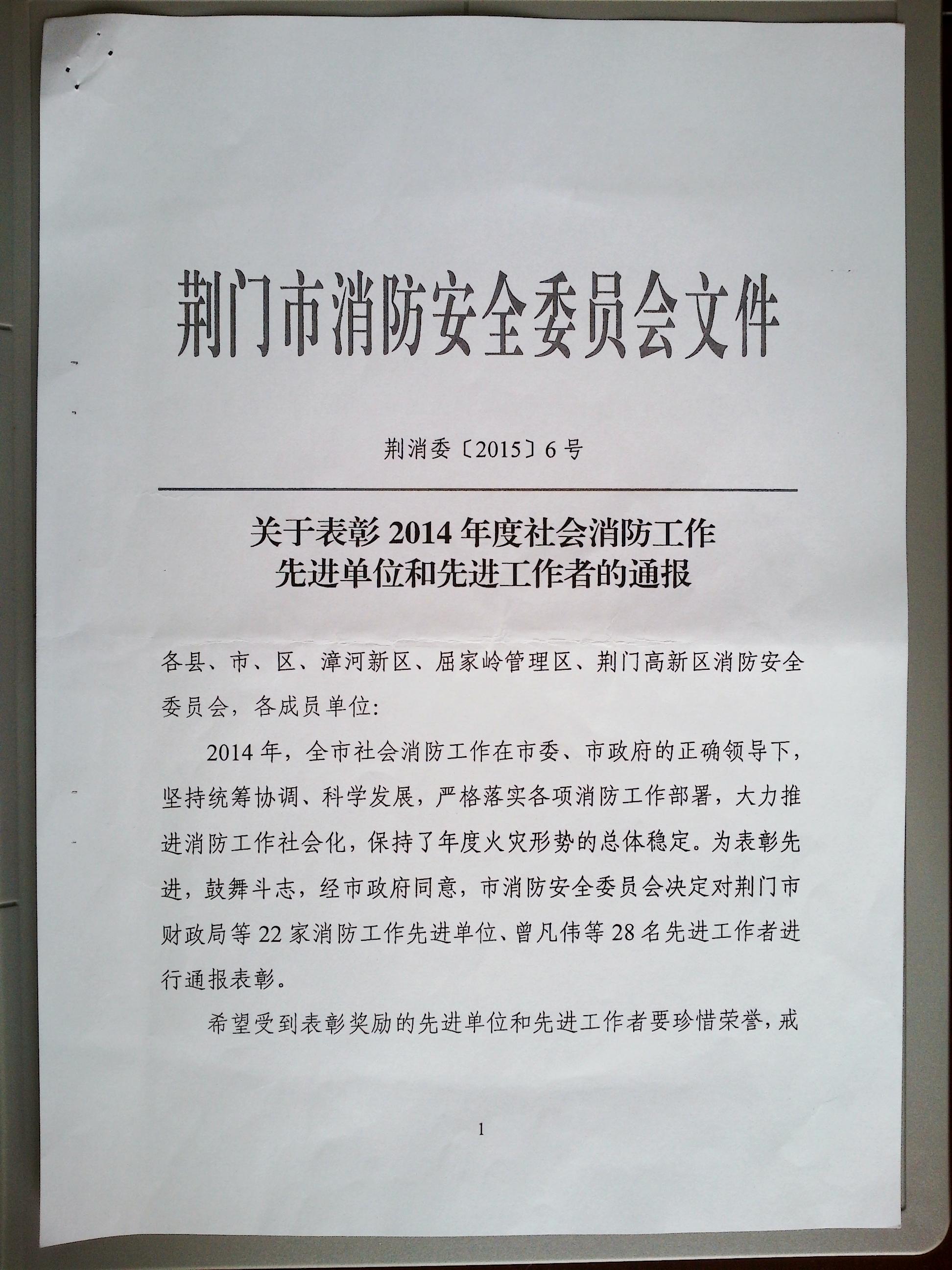 榮譽(yù)快訊;公司獲2014年度消防工作先進(jìn)單位
