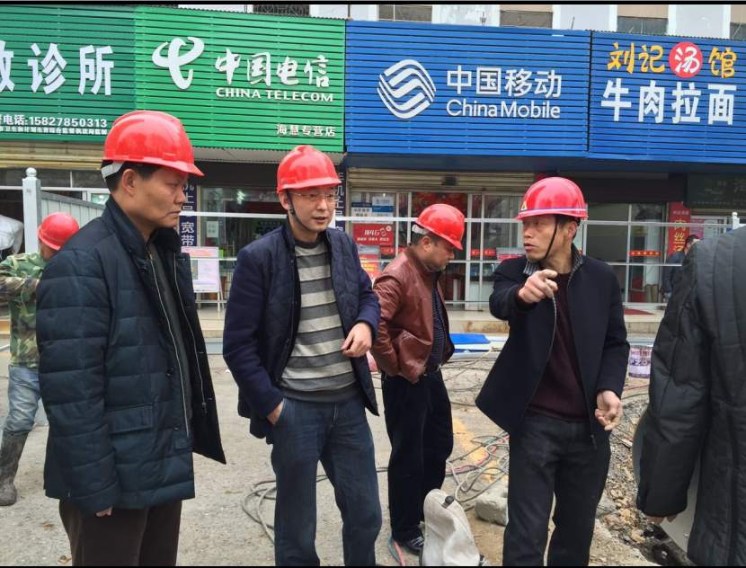 荊門市供水總公司黨委書記、總經(jīng)理陳永根(左二)等在象山大道?;鄣叵峦ǖ拦┧艿朗┕がF(xiàn)場(chǎng)。