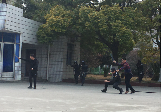 本次演練以在全國“兩會”召開前夕,2名暴恐份子密謀在市供水總公司三水廠采取投毒方式實(shí)施暴恐襲擊為背景展開。市公安局指揮中心接到水廠員工報(bào)案,2名暴恐份子駕車攜帶劇毒氰化物和匕首來到三水廠,密謀投毒、傷人。市公安局指揮中心立即派轄區(qū)派出所和巡邏組前往處置。在投毒失敗后,嫌疑人刺傷安保人員并挾持人質(zhì),與民警對峙。隨后,市公安局迅速啟動反恐防范一級響應(yīng),調(diào)派轄區(qū)分局、巡特警、刑偵、交警等部門趕赴現(xiàn)場開展工作。短短3分鐘,暴徒迅速被控制,其中有一名暴徒被當(dāng)場擊斃,人質(zhì)被成功解救。之后,120急救中心趕往現(xiàn)場救治,同時(shí)環(huán)境監(jiān)測部門迅速開展水質(zhì)檢測評估,確保水廠供水安全。至此,反恐防暴演練活動順利結(jié)束。