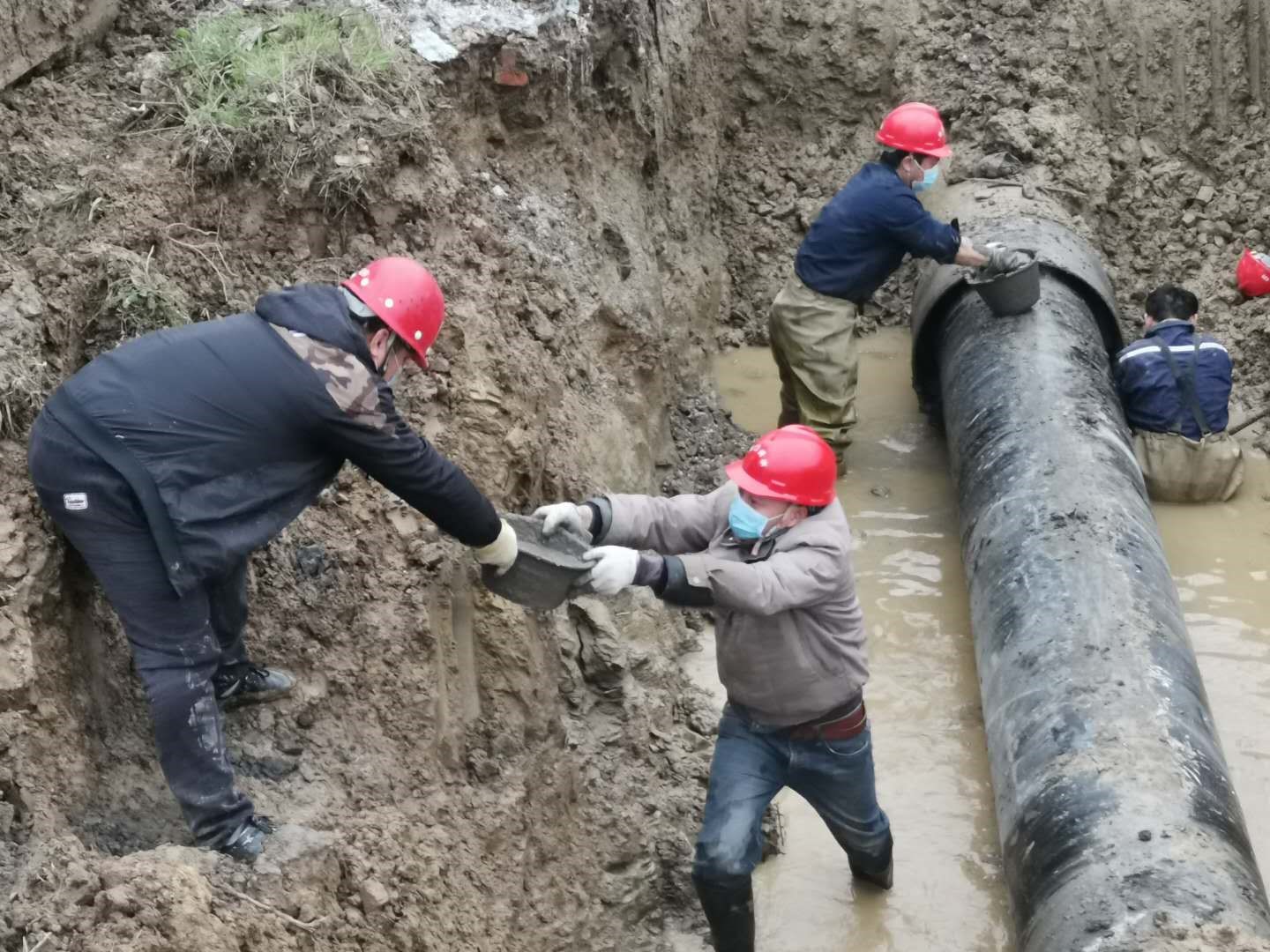 2月23日10時,掇刀區(qū)迎春大道人福藥業(yè)門前DN600mm主供水管道突發(fā)爆管,供水維修部門迅速啟動疫情期間應急搶修預案,組織人員、工程機械、維修設備趕赴現(xiàn)場,經(jīng)過9個多小時的緊張搶修,于當日晚7點42分恢復了供水。緊接著次日8點,東寶區(qū)科陽路DN600mm主供水管道突發(fā)爆管,巡查人員現(xiàn)場核實后迅速止水,并及時通告用戶停水信息后開始倒閘排水,到13時左右開挖出爆管的DN600的主供水管道出現(xiàn)在大家面前,相比前日的搶修,整段水管因裂口較大損壞嚴重,不能簡單修復,只能現(xiàn)場立即制定可靠的管道更換維修方案。當時,全部工作人員從早上到現(xiàn)場已經(jīng)工作了5個小時,滴水未進,但大家為保障搶修進度,仍然堅持一邊加班加點對基坑進行處理,一鼓作氣將破損管道清理出來,做好對接管道的清淤工作。另一邊搬運快干水泥,切割、加工、運輸、吊裝管道,14點35分把全部材料物資運抵現(xiàn)場開始作業(yè)。隨后,大家在泥地里匆匆啃了幾口方便面后,又投入到緊張的搶修工作中,終于在18點17分完成了維修,待水泥養(yǎng)護好后,于21點27分通水,及時保障了科陽路企業(yè)和周邊居民的正常生產(chǎn)生活用水。